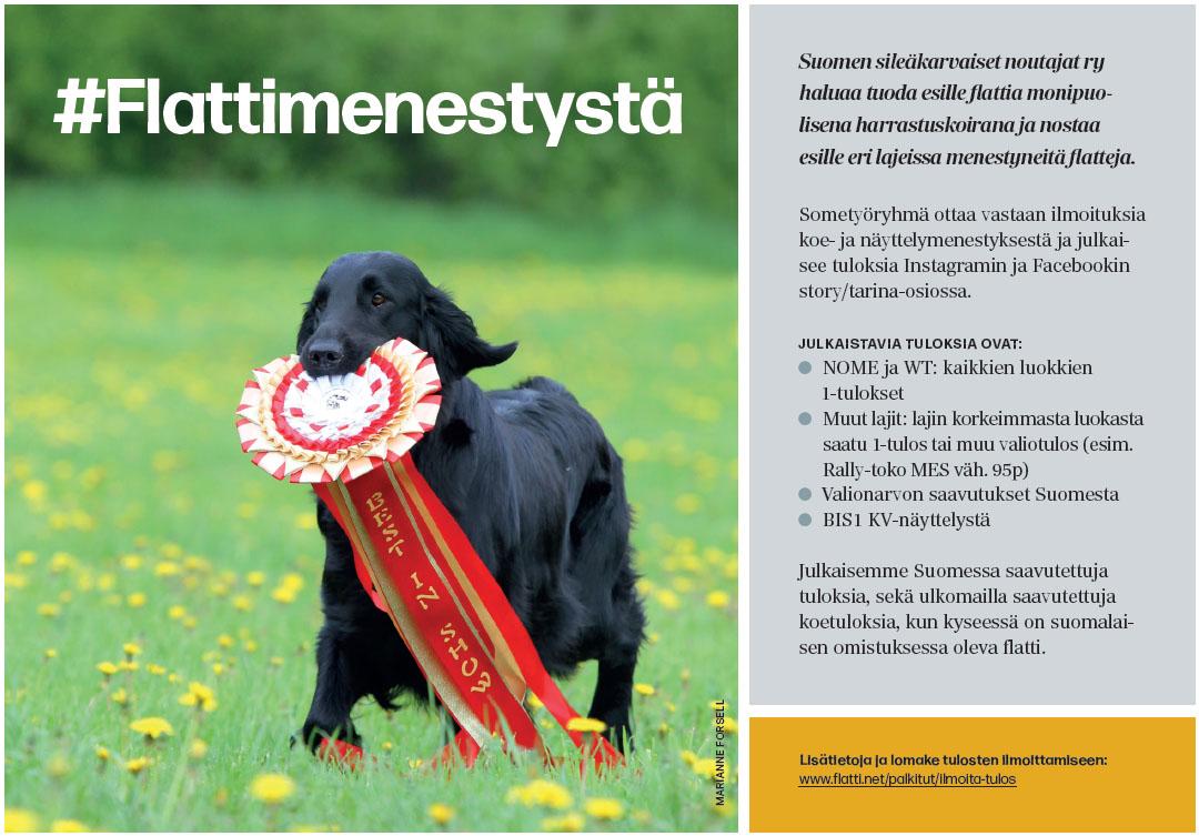 Suomen sileäkarvaiset noutajat ry haluaa tuoda esille flattia monipuolisena harrastuskoirana ja nostaa esille eri lajeissa menestyneitä flatteja. Sometyöryhmä ottaa vastaan ilmoituksia koe- ja näyttelymenestyksestä ja julkaisee tuloksia Instagramin ja Facebookin story/tarina osiossa.